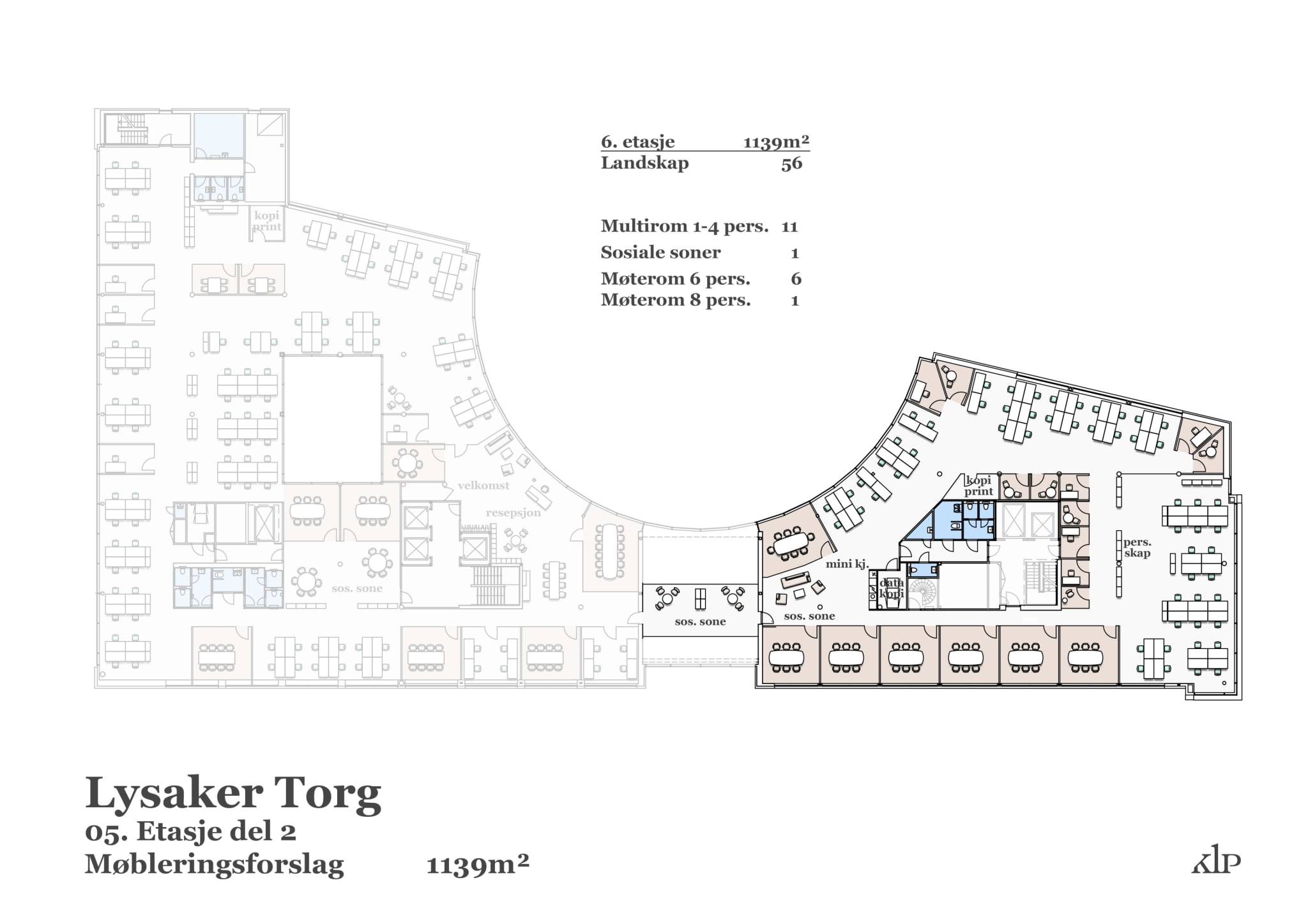 Antall arbeidsplasser avhenger av planløsning og fordelingen mellom åpne plasser i landskap og cellekontorer. God tilgang til takterrasse.